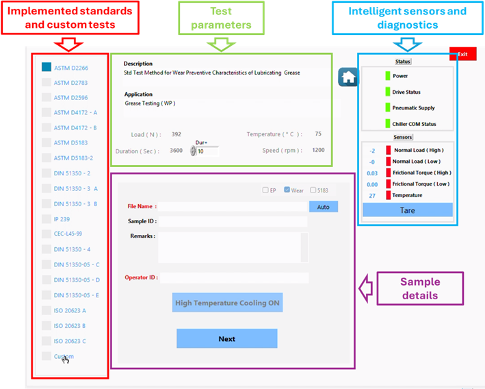- select the desired standard (i.e., for EP tests ASTM D2783 and ASTM D2596 can be selected for oils and greases respectively) and the parameters customized whenever the standards allow it (red and green areas, respectively).