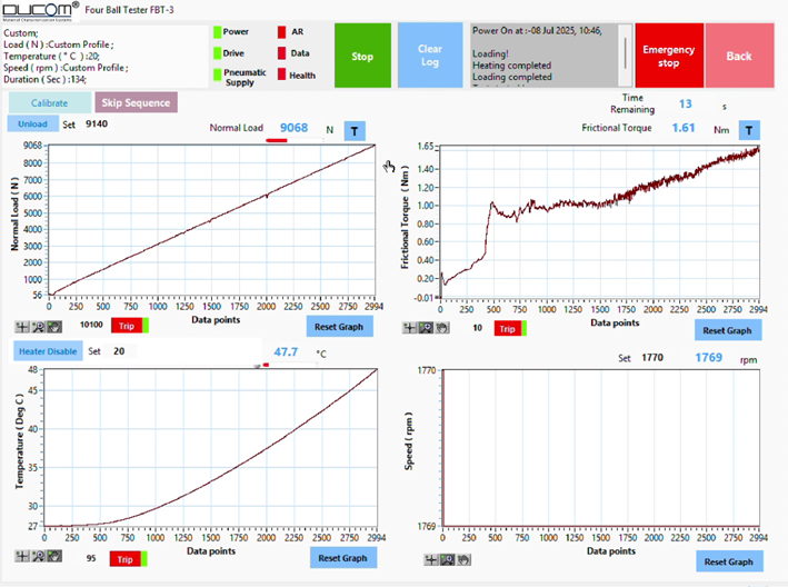 - If seizure has occurred, the applied normal load can be considered as weld load. The machine automatically detects seizure and stops the test when friction torque exceeds 10 Nm.
