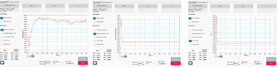 - Clicking on Run Test, the instrument will start applying the load and reaching the test temperature by heating or cooling the test area. When both applied load and temperature will correspond to the standard values, the test will start. In the same screen you can monitor all the most important outputs to check that the test is being correctly carried out. Normal Load (N), Frictional Torque (Nm), Temperature (°C) and Speed (rpm).